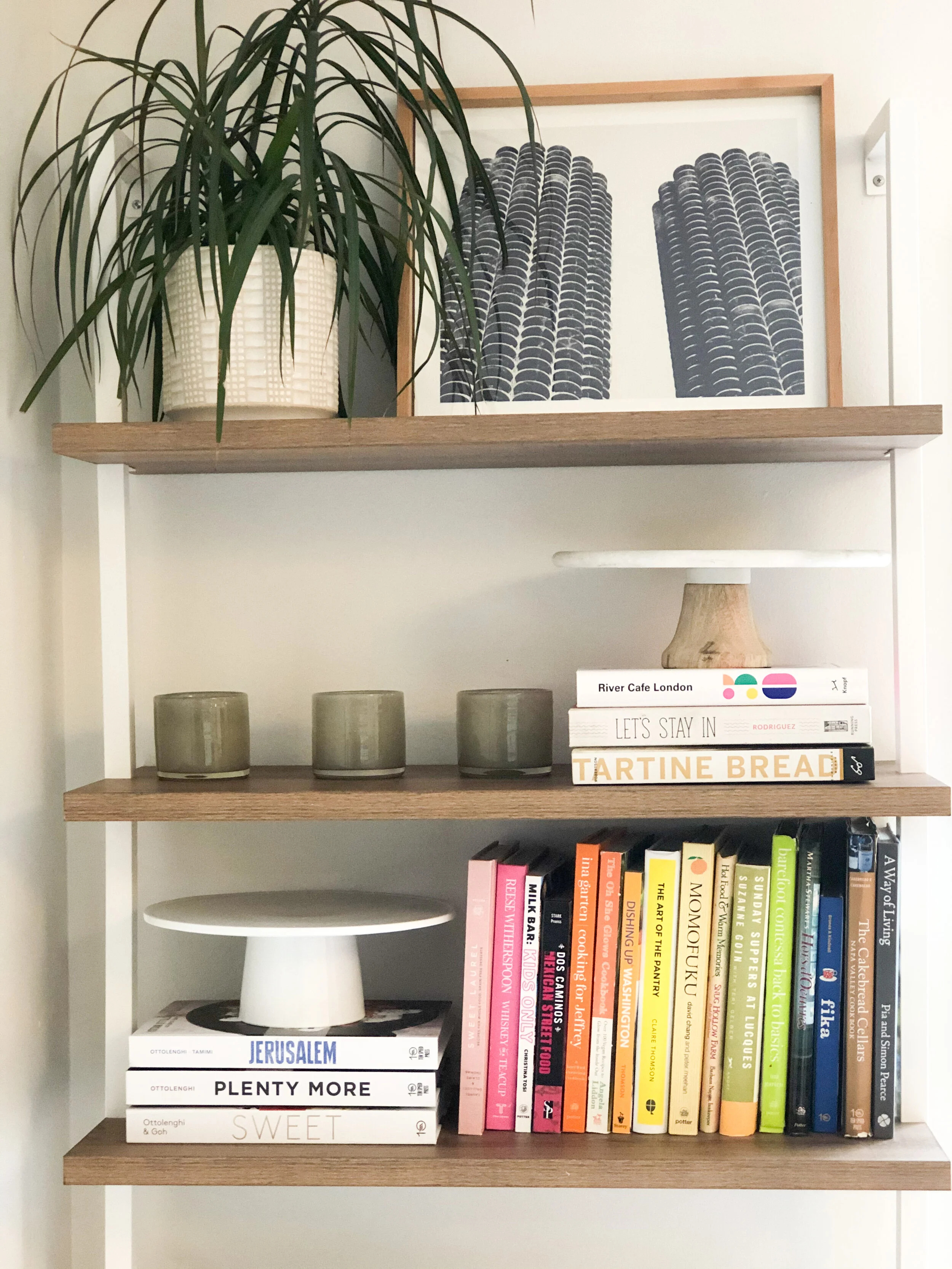 Stack well. I chose to employ two different techniques with my stacking game, which serve to highlight specific books. The first was a monochromatic technique, which was an easy choice with a majority of my cookbooks having a white spine. The second was stacking by author. I’m a huge fan of Yotam Ottolenghi, so he received pride of place with his own stack.